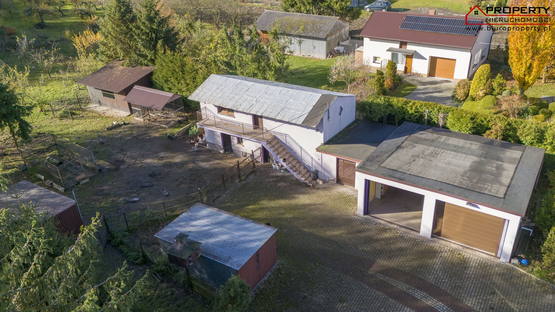 Na posesji znajduje się duży murowany z pustaka dwustanowiskowy garaż. Budynek jest ocieplony a także posiada dwie bramy automatyczne na pilota. Drugi budynek gospodarczy ma powierzchnię 55m2. Jest wybudowany z cegły i pustaka. Składa się z kuchni letniej i pomieszczenia gospodarczego. Dodatkowo na posesji znajdują się 3 garaże blaszane.