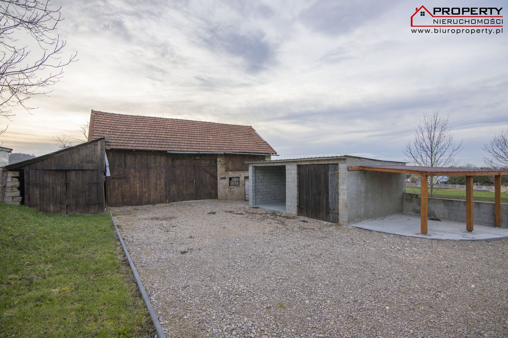 Dom usytuowany na dwóch działkach o numerach 217/1 i 216 o łącznej powierzchni 1,34ha. Nieruchomość częściowo ogrodzona, zagospodarowana. Na posesji znajduje się murowano-drewniana stodoła o powierzchni około 120m2 kryta dachówką cementową oraz 2 murowane garaże oraz altana.